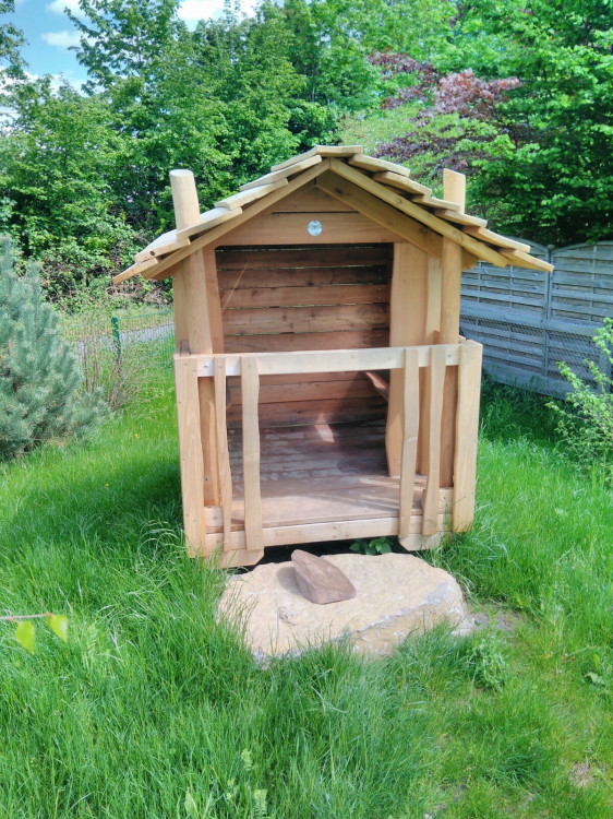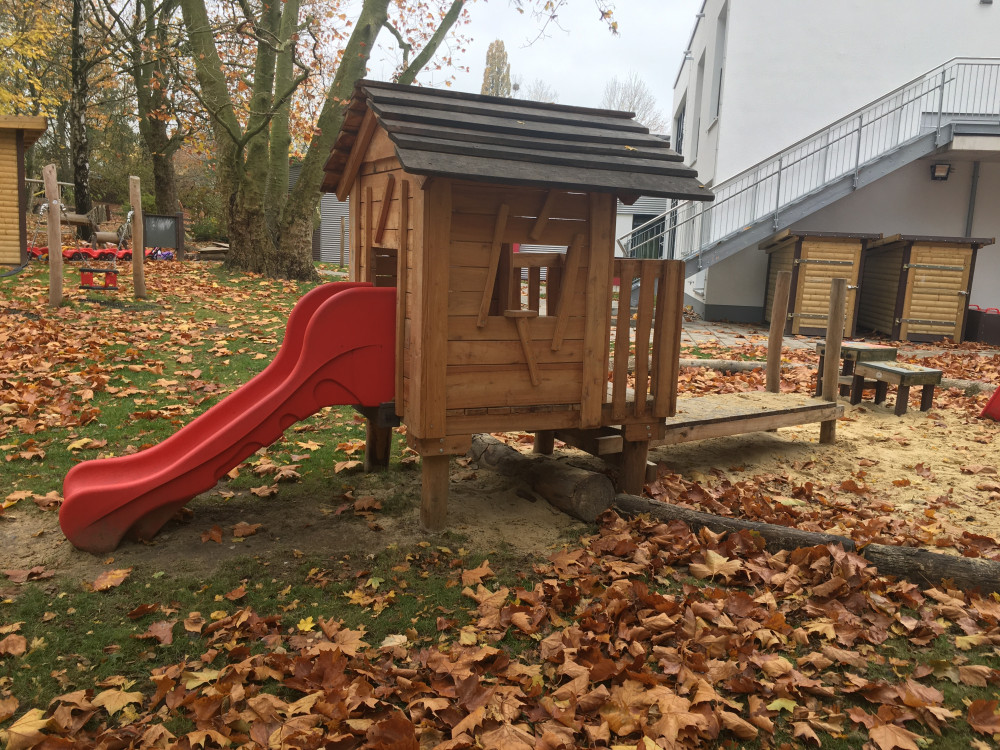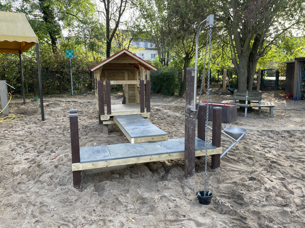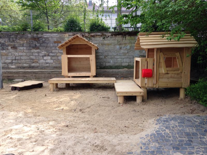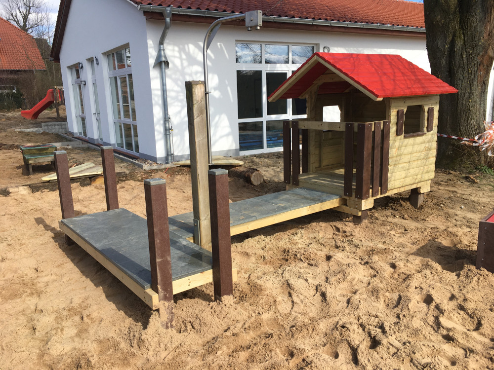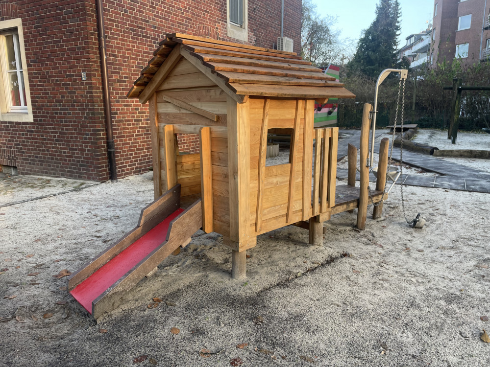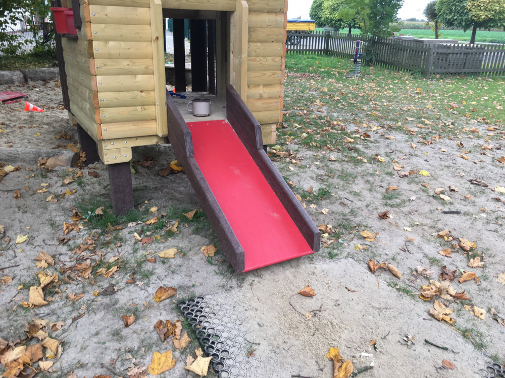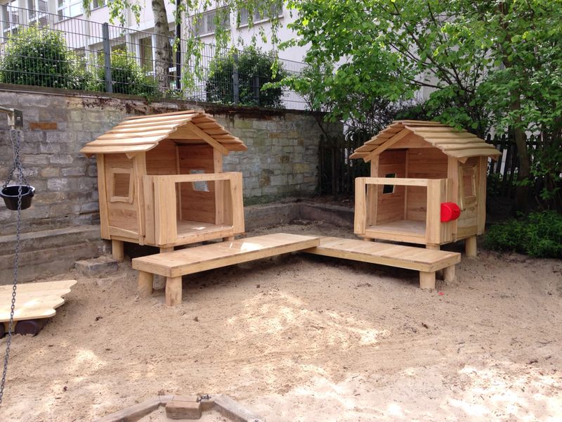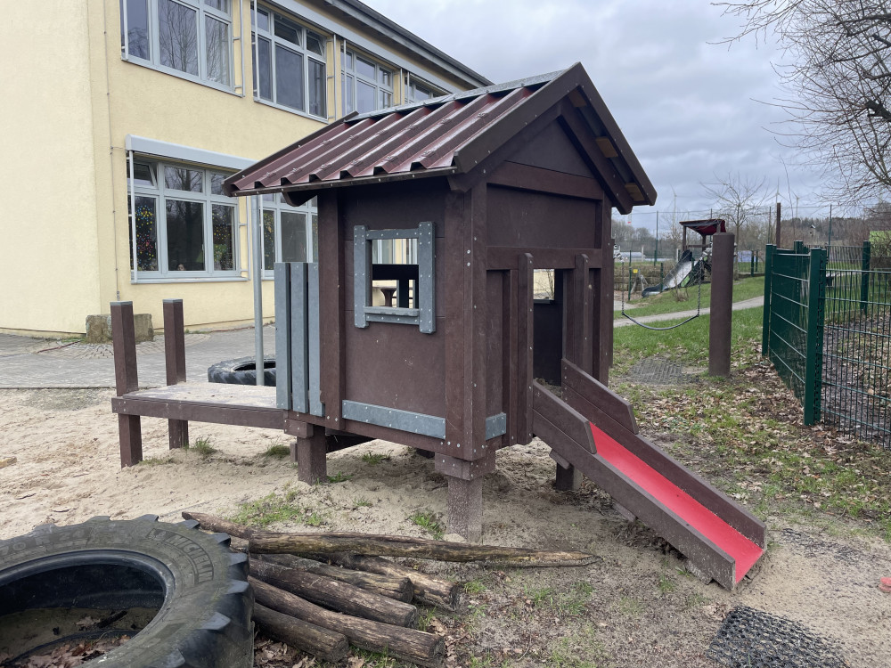 Die Brücke/der Steg sorgt für Bewegung und Abwechslung: raufgehen, rüberlaufen, wieder zurück – das fördert ganz nebenbei Balance, Koordination und Körperspannung. Gleichzeitig ist das Häuschen ein toller Treffpunkt, an dem mehrere Kinder gemeinsam spielen können, ohne dass es langweilig wird: einer „wohnt“ drin, der nächste steht am Fenster, andere kommen über die Brücke dazu.