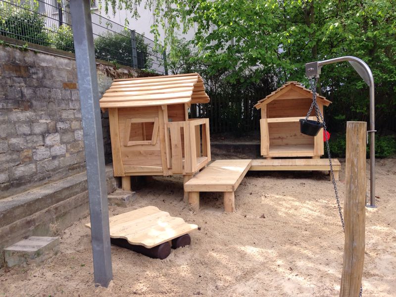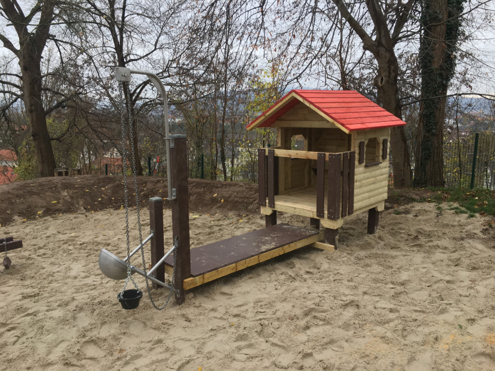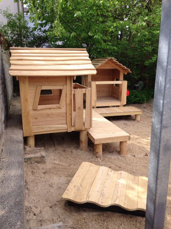 Dieses Spielgerät ist ein kleines Spielhaus mit Brücke, das Kinder sofort zum Rollenspiel einlädt. Im Häuschen können sie sich zurückziehen, „Besuch“ empfangen oder eigene Geschichten erfinden – vom Kaufmannsladen bis zur kleinen Feuerwehrstation. Durch die Fenster entsteht ein offenes, freundliches Gefühl: Kinder können hinausschauen, miteinander sprechen und das Spiel von innen und außen verbinden.